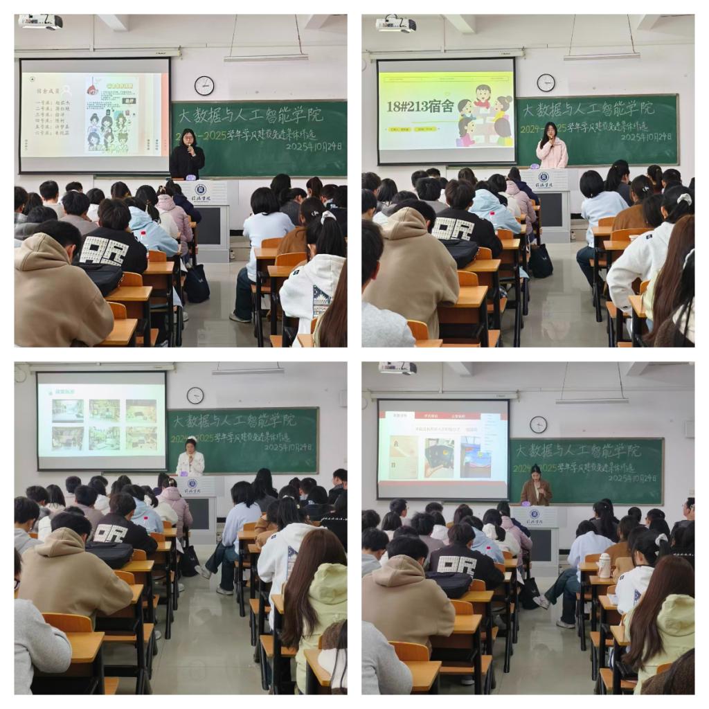 为表彰在学风建设方面表现突出的班集体和宿舍,树立先进典型,营造比学赶超、奋发向上的良好学习氛围,推动学院优良学风的形成,根据《信阳学院关于评选2024-2025学年学风建设先进集体的通知》(校学字〔2025〕45号)文件要求,10月24日下午,大数据与人工智能学院在人文楼115教室开展2024-2025学年学风建设先进班集体和先进宿舍评选活动。全体辅导员和2025级部分学生代表出席此次活动。