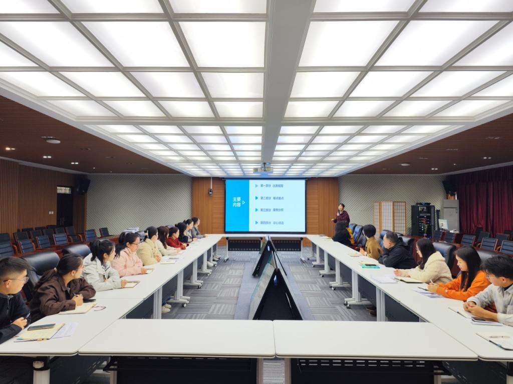 房蕾老师围绕大赛的核心环节,从“比赛规程解读”“难点重点剖析”“案例分析策略”与“谈心谈话技巧”四个维度进行了系统而深入地讲解。在比赛规程方面,她细致梳理了赛事流程、评分标准及注意事项,帮助大家明晰备赛方向。针对难点重点,她结合历年考试知识点和自己的实战经验,指出了理论储备、临场应变等方面的关键所在。在案例分析与谈心谈话这两个实践性极强的环节,她不仅分享了分析问题的逻辑框架、解决问题的有效路径,还通过情景再现、要点归纳等方式,传授了沟通艺术、共情技巧以及引导学生成长成才的方法策略。整场辅导内容丰富、逻辑清晰、干货满满,既有理论高度,又有实践温度,赢得了在场辅导员的阵阵掌声。