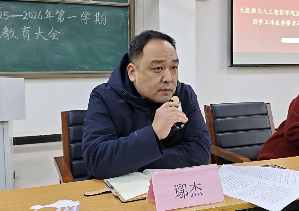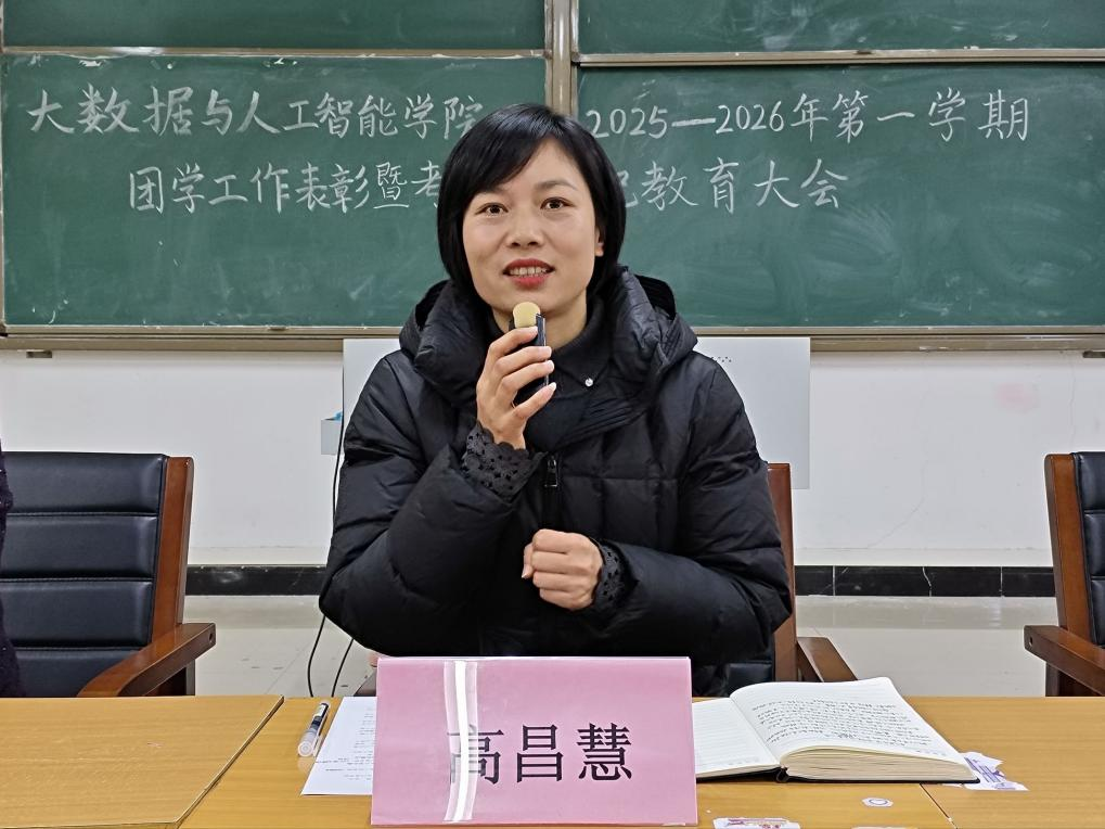 为全面总结本学期团学工作成绩,表彰先进集体与个人,部署期末考风考纪教育工作,进一步凝聚共识、严肃学风,2026年1月4日下午,大数据与人工智能学院在人文楼108教室隆重举行2025-2026学年第一学期团学工作总结表彰暨考风考纪教育大会。学院党总支书记高昌慧、学工干事鄢杰、团总支书记徐瑞爽、全体辅导员及学生干部代表出席大会。会议由徐瑞爽主持。
