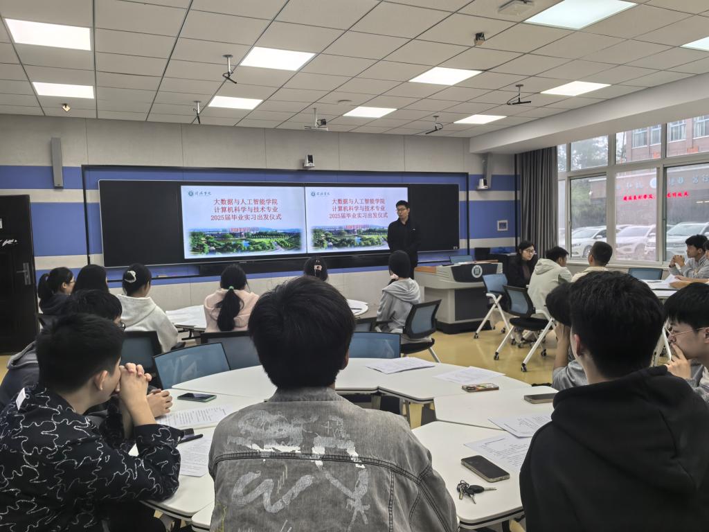 为进一步提升计算机科学与技术专业师范毕业生的教育教学能力,提高学生对未来职业生涯的适应能力,10月17日,大数据与人工智能学院在人文楼南楼111智慧教室举行了2025届计算机科学与技术专业毕业生教育实习出发仪式。出席仪式的有学院党总支书记郭二军,计算机科学与技术专业教研室主任贾彦茹、辅导员晏祥、周川川 、带队老师尹光花及20余名毕业生。