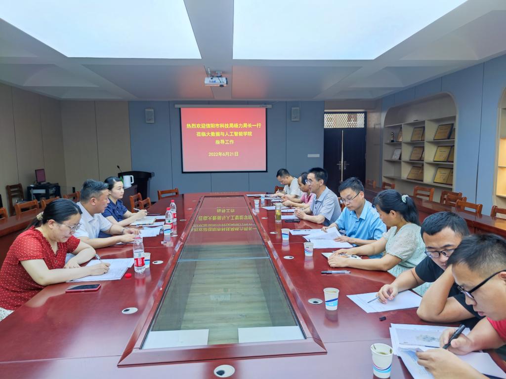 6月21日下午,信阳市科技局副局长杨力、信息中心处主任柴玥和林玲一行来大数据与人工智能学院考察交流,座谈会在数计楼407会议室举行。院长邬长安、教学副院长黄俊、党总支副书记毛凤翔、教研室主任师春灵和张冬松、教师代表文成、陈泽、田青云参加了座谈会。会议由黄俊主持。