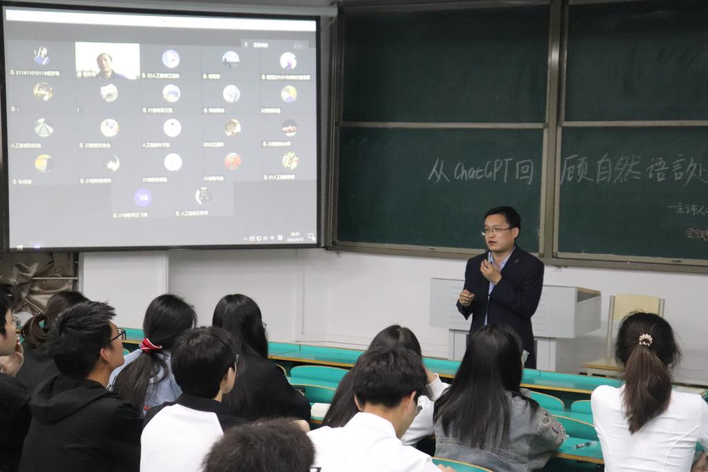 4月12日晚,河南省教育厅学术技术带头人,国家公派英国哈德斯菲尔德大学访问学者张冬松博士应邀作了题为《从ChatGPT回顾自然语言处理的发展》的线上学术讲座,大数据与人工智能学院党总支副书记毛凤翔、学工干事鄢杰及学院百余名学生在数计楼105教室聆听了报告,报告由毛凤翔主持。
