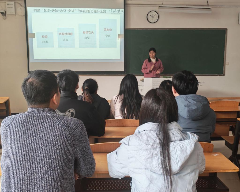 交流会上,邹老师首先直面青年教师在科研工作中面临的时间碎片化、团队资源匮乏、实验平台短缺、学术网络薄弱等痛点问题,引发了在场教师的强烈共鸣。随后,围绕校级科研项目、校级教改项目、信阳市社科联项目三类核心项目,详细解读了各类项目的申报时间、定位特色、申报资格及核心要求。针对校级科研项目“起步与积累”的核心定位,重点分享了选题技巧、团队组建、研究方案设计等实操经验,强调要结合自身优势与领域特点,突出项目创新性与可行性;针对校级教改项目“教学与科研融合”的核心目标,以具体案例解析了立项依据撰写、实施方案设计的关键要点,鼓励教师聚焦教学痛点,探索教学新模式与新方法;针对信阳市社科联项目“区域需求与应用创新”的导向,明确了选题需紧扣地方发展需求、强化跨学科协作的申报思路。