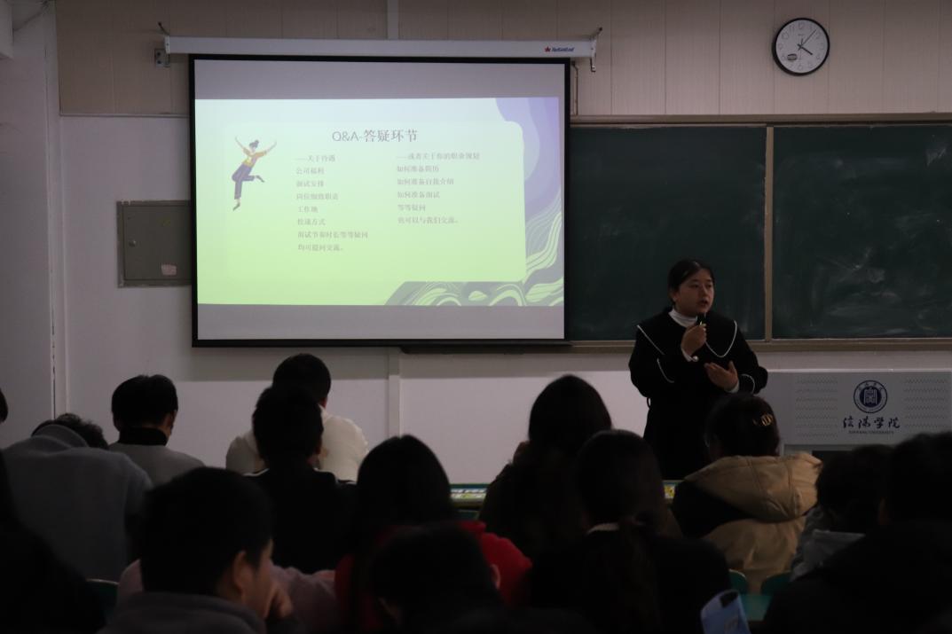 宣讲会进入答疑解惑环节,华为慧通HR何欣与在场的同学进行了深入的讨论和交流。同学们积极踊跃的参与发言,结合自身实践经历提出自己心中的问题和疑惑,何欣也结合招聘岗位实际情况向同学们介绍了岗位的工作待遇、福利保障、工作内容及晋升途径等,针对学生的职业发展规划提出更好的建议。