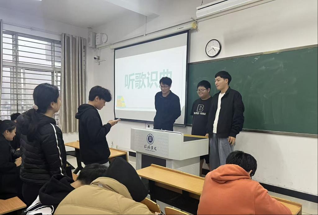 “听歌识曲”环节则掀起了全场的青春共鸣。辅导员精心挑选了校园热歌、经典励志曲、流行金曲等多样曲目,熟悉的旋律一响起,同学们踊跃抢答,不少人跟着旋律轻声合唱。《追梦赤子心》《夜空中最亮的星》《稻香》等歌曲不仅唤起了大家对大学生活的美好回忆,更传递出积极向上的正能量,让现场氛围既温馨又充满力量。
