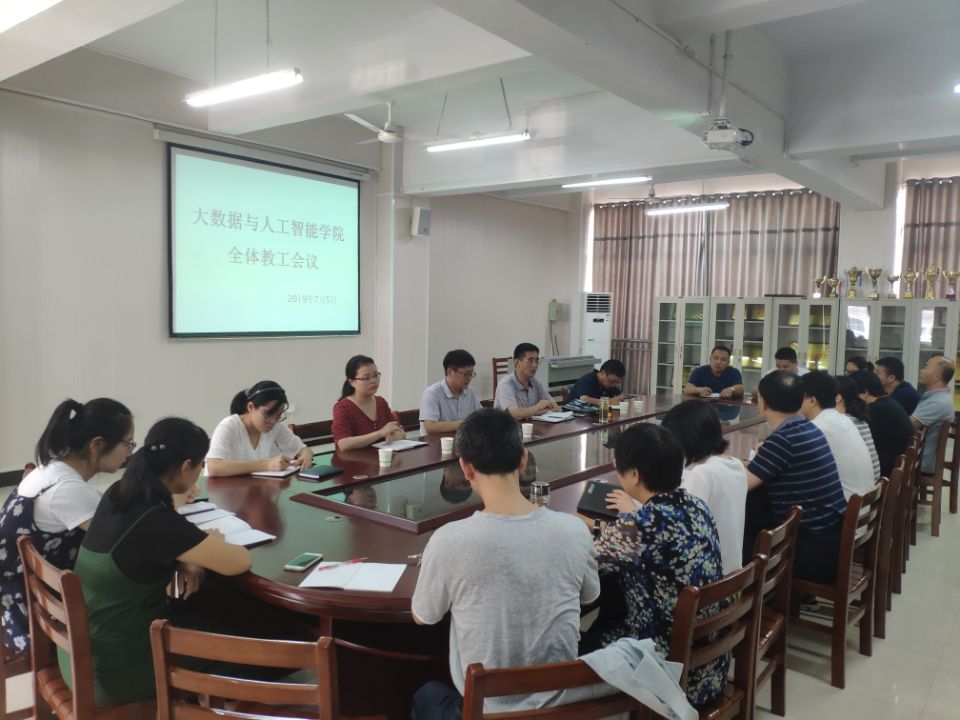 7月5日下午,大数据与人工智能学院在教二楼会议室召开全体教师会议,校长助理杨高伟,院长邬长安,党总支书记胡秀云,教学秘书毛凤翔,学工干事司杰和全体教师参加了会议。