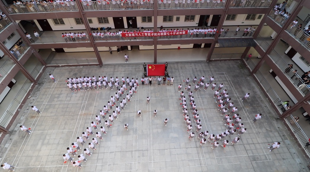 9点40下课,“我和我的祖国,一刻也不能分割……”《我和我的祖国》的旋律在数计楼内顿时响起,大数据与人工智能学院300余名师生纷纷来到楼下广场聚在一起摆成“70”字样,挥舞着手中的小红旗共唱祖国赞歌,来往上课的同学们纷纷驻足观看,不多时,数计楼内每一层走廊里都站满了学生,一面面五星红旗在人群中挥舞,深情高亢的歌声在楼内回荡。