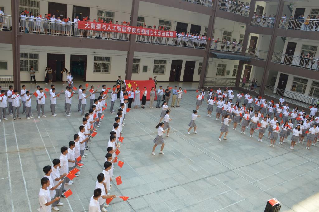 同唱祖国赞歌,青春快闪献礼祖国70华诞。9月29日上午课间操,大数据与人工智能学院 “青春·为祖国歌唱”快闪活动在数计楼小广场举行,院长邬长安,党总支书记胡秀云和来往上课的千余名师生参与其中,活动现场,千人高歌齐颂祖国,共同表达对祖国母亲70岁生日的祝贺。