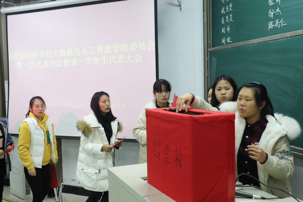 大会接着通过了《共青团大数据与人工智能学院推选参加学校第一次“双代会”正式代表的选举办法》,然后通过监票人和计票人名单;最后,代表们根据候选人的名单和投票规则进行投票,经过监票人和计票人的统计,大会民主选举产生了代表学院参加学校第一次“双代会”的8名正式团员代表和10名正式学生代表。