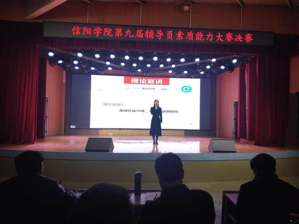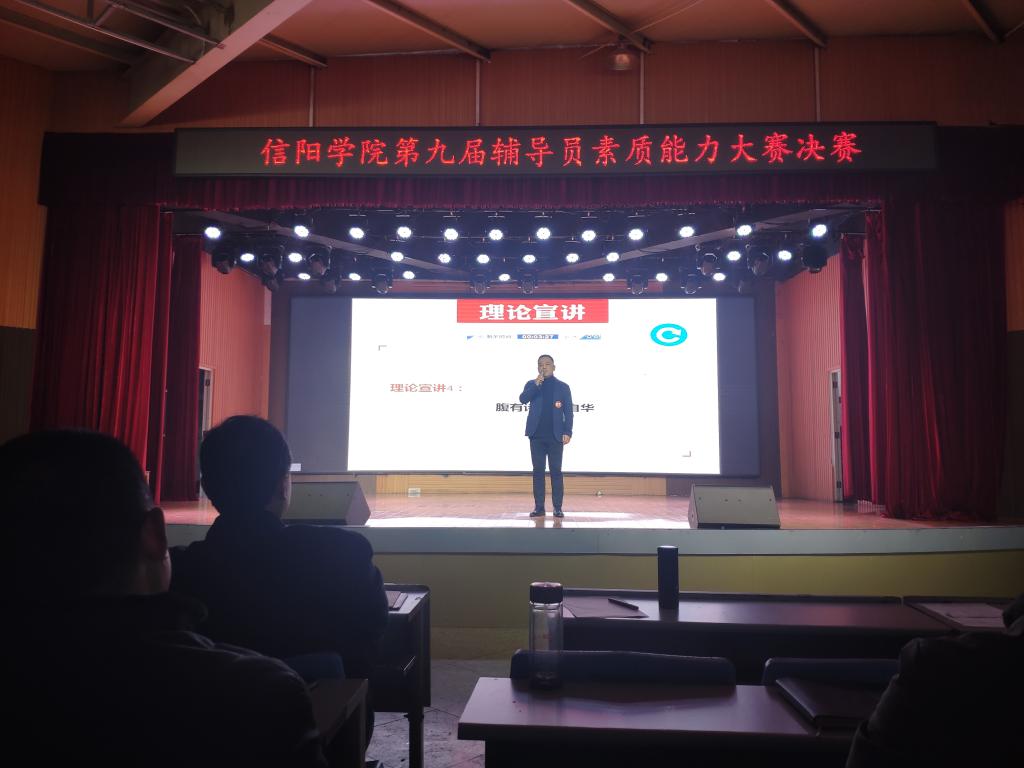 12月25日,信阳学院第九届辅导员素质能力大赛决赛在大学生活动中心隆重举行。从辅导员笔试、案例分析到谈心谈话再到最后一个环节的理论宣讲,我院辅导员曹晶晶、鄢杰过关斩将,最终以全校第二名和第五名的好成绩荣获大赛二等奖、三等奖,学院荣获优秀组织奖。