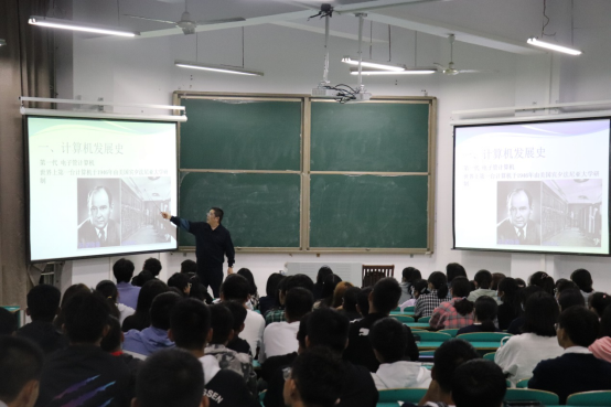 学院特聘教授杜祝平首先介绍了学院计算机科学技术专业的发展情况,并指出该专业是学校最早招生的专业之一,随后围绕计算机的发展历程与重要节点,并以手机、电脑里的芯片为例,从芯片研发和进口,一直讲到现实应用和实际意义,全面阐释了计算机在人类发展史和社会变革过程中的重大意义。