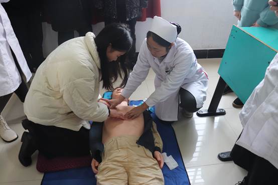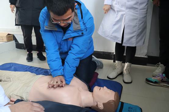 易顺梅用通俗易懂的语言详细介绍了心脏病的危害和身体各个器官对无氧缺血的耐受能力,详细讲述了心肺复苏基本理论,使同学们了解一些医学专有名词:“生物学死亡”、“黄金六分钟”、“第一响应”等,熟悉心肺复苏的几个关键步骤:判断病人情况、徒手开放病人身体气道、口对口对病人进行人工呼吸、对病人实施胸外按压。随后,易顺梅、丁宁、张蕊等医生分别利用道具向同学们演示了心肺复苏法的相关流程,并强调了实施过程中的一些细节以及抢救有效、终止的指标。讲座结束后,李进带头进行了心肺复苏模拟实验,易顺梅等医生手把手的耐心指导大家,同学们进一步掌握了心肺复苏急救技能。