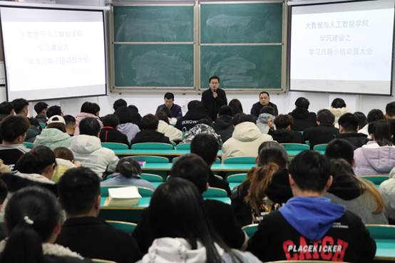 会上,李进总结了学院上一学期在学风建设等方面取得的成绩,指出了在学风和考风中存在的主要问题,再次强调了学风建设的重要性。他指出:要落实好早晚自习纪律,严抓考风考纪,着力降低我院学生重修和补考率,学院研究决定成立大数据与人工智能学院学习兴趣小组。李进就成立学习兴趣小组实施管理办法进行了详细说明。毛凤翔书记就成立学习兴趣小组提出了要求,他要求各班学习委员、寝室长发挥模范带头作用,组织好班级同学,踊跃报名。同时,他提出把寝室长列入学生干部管理范围,表现优秀的可优先参与评优评先。他还为每位学生布置了“作业”即写下未来的规划和打算,并在每一学期结束后进行阶段性检验。