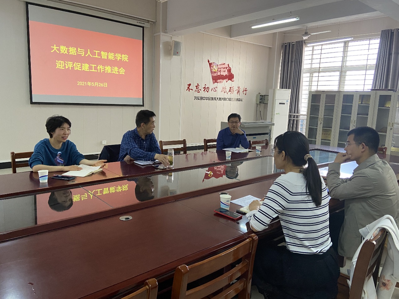 5月26日上午,大数据与人工智能学院在数计楼407召开迎评促建工作推进会,安排部署期末评建工作。院长邬长安、党总支副书记毛凤翔、以及班子成员参加此次会议,会议由毛凤翔主持。