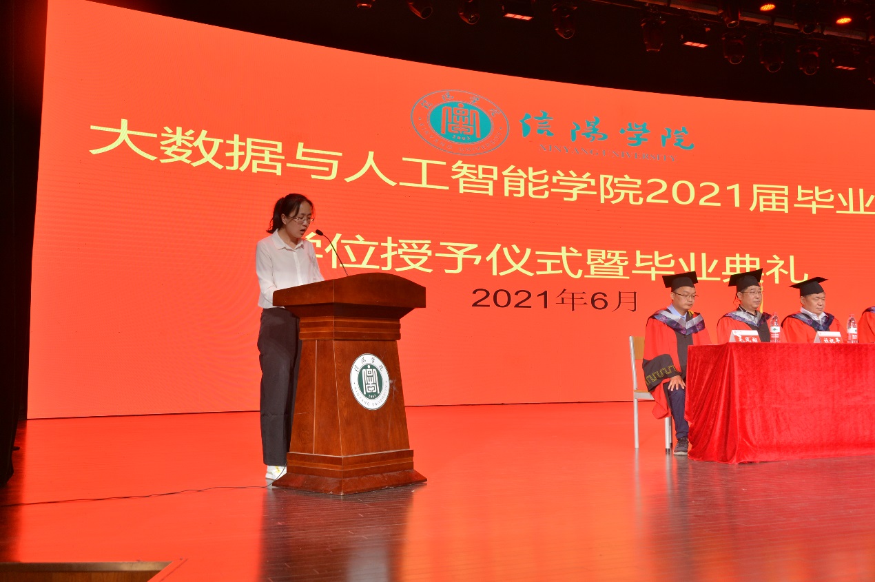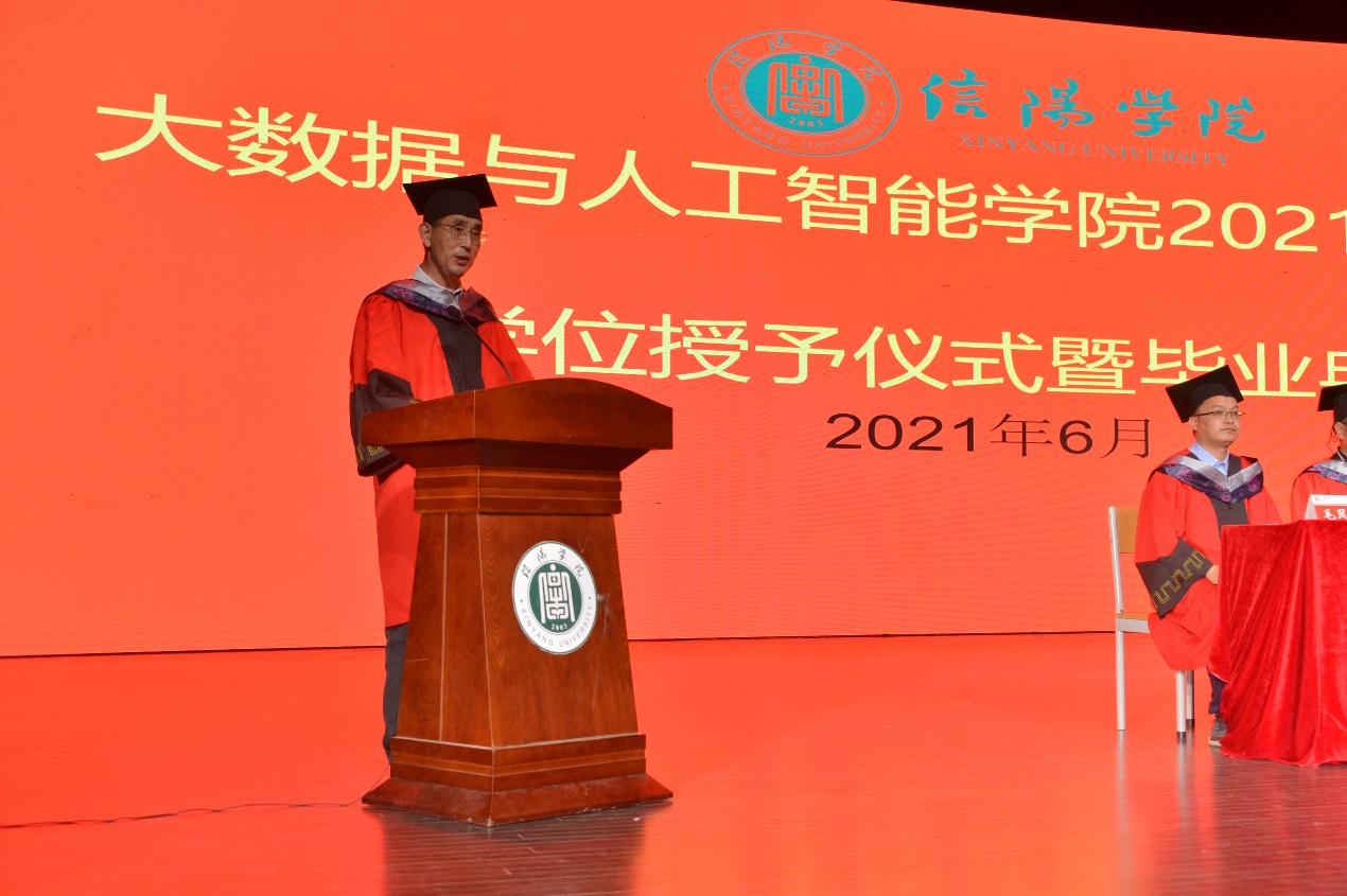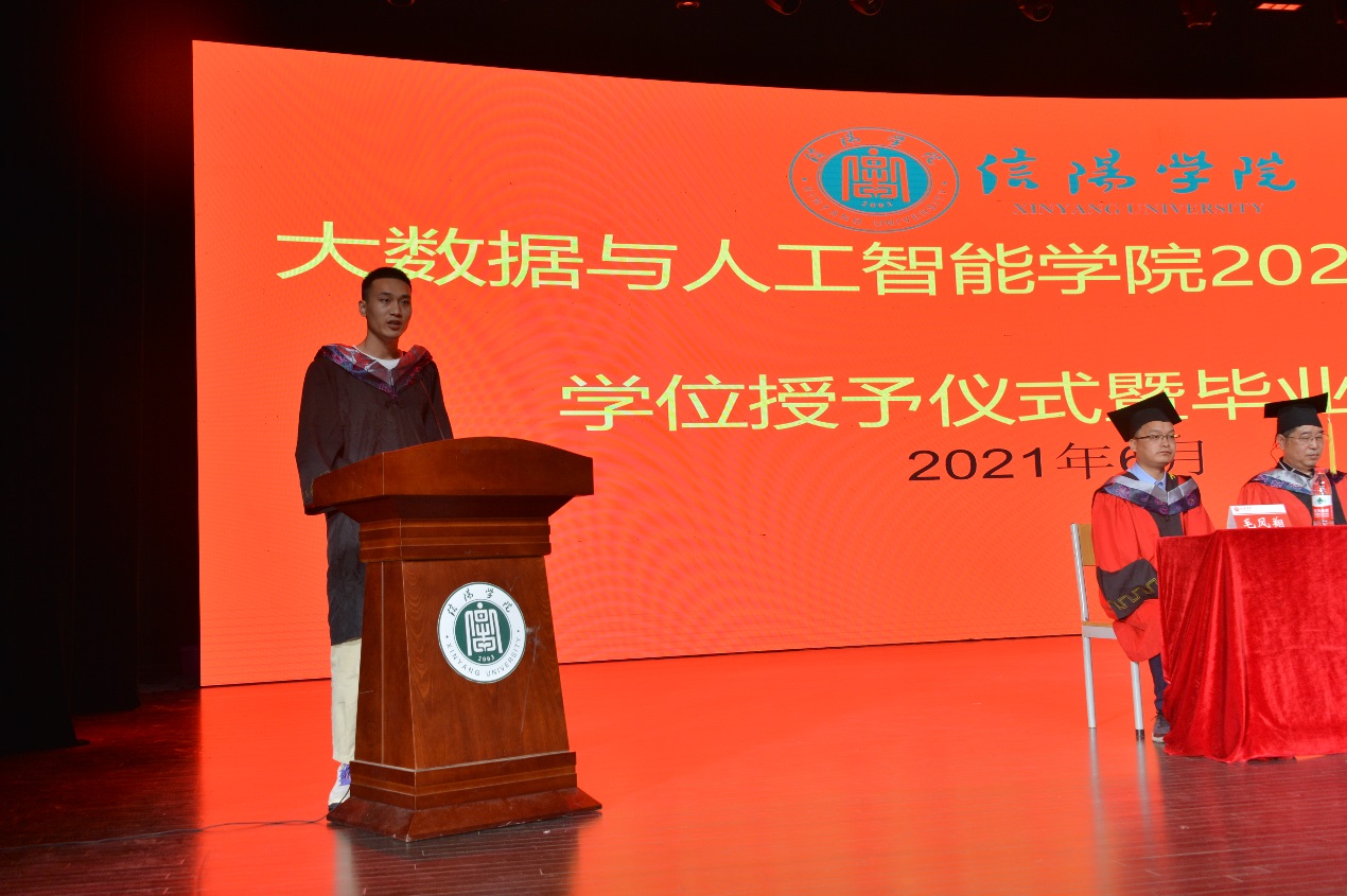 教学副院长宣读《信阳学院关于授予2021届本科毕业生学士学位的决定》。院长邬长安发表了毕业致辞,他首先代表学院向圆满完成学业的毕业生表示祝贺,2021届毕业生见证了大数据与人工智能学院的诞生、建设、成长的全过程,是学院的建设者、贡献者。在大数据,云计算、人工智能等新技术快速发展的时代,邬长安院长对即将离开校园的同学们提出几点希望:一希望同学们做一个勤于学习、善于思考的人,好读书,读好书,不断地从他人、从书本、从媒体、从实践中学习知识,武装自己,把握时代脉搏,陶冶情操品格,增强能力本领,并争取引领时代。二希望同学们能够在时代大潮中,把握机遇,找准自己的人生目标,立大志,入主流,从小事做起,脚踏实地,保持定力,不怕寂寞,持之以恒,有所作为。三希望同学们将竞争压力转化为奋斗动力,激流勇进,勇于竞争,努力成为具有较强社会竞争能力的人。