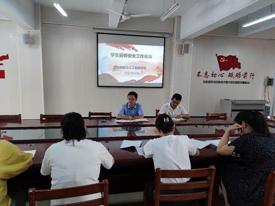 6月22日下午,大数据与人工智能学院在数计楼407会议室召开了学生暑假安全工作专题会议。学院党总支副书记毛凤翔、学工干事李进、团总支书记鄢杰以及全体辅导员参加会议,此次会议由李进主持。