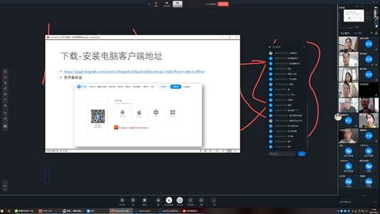 陈致超老师通过钉钉群在线课堂,现场模拟了一场线上授课。从下载安装软件、创建群、开启直播、区分授课模式、互动面板、制作课堂小测、直播回放、直播数据导出、在线布置及批改作业等方面具体演示了钉钉教学的操作方法,强化教师对钉钉线上教学使用的熟练度。利用此次交流会,郭晶晶老师针对参加学校组织的雨课堂教学培训的教师们的疑问进行逐一解答,多平台多方位最大限度保障教学要求不降低,教学质量不打折扣。
