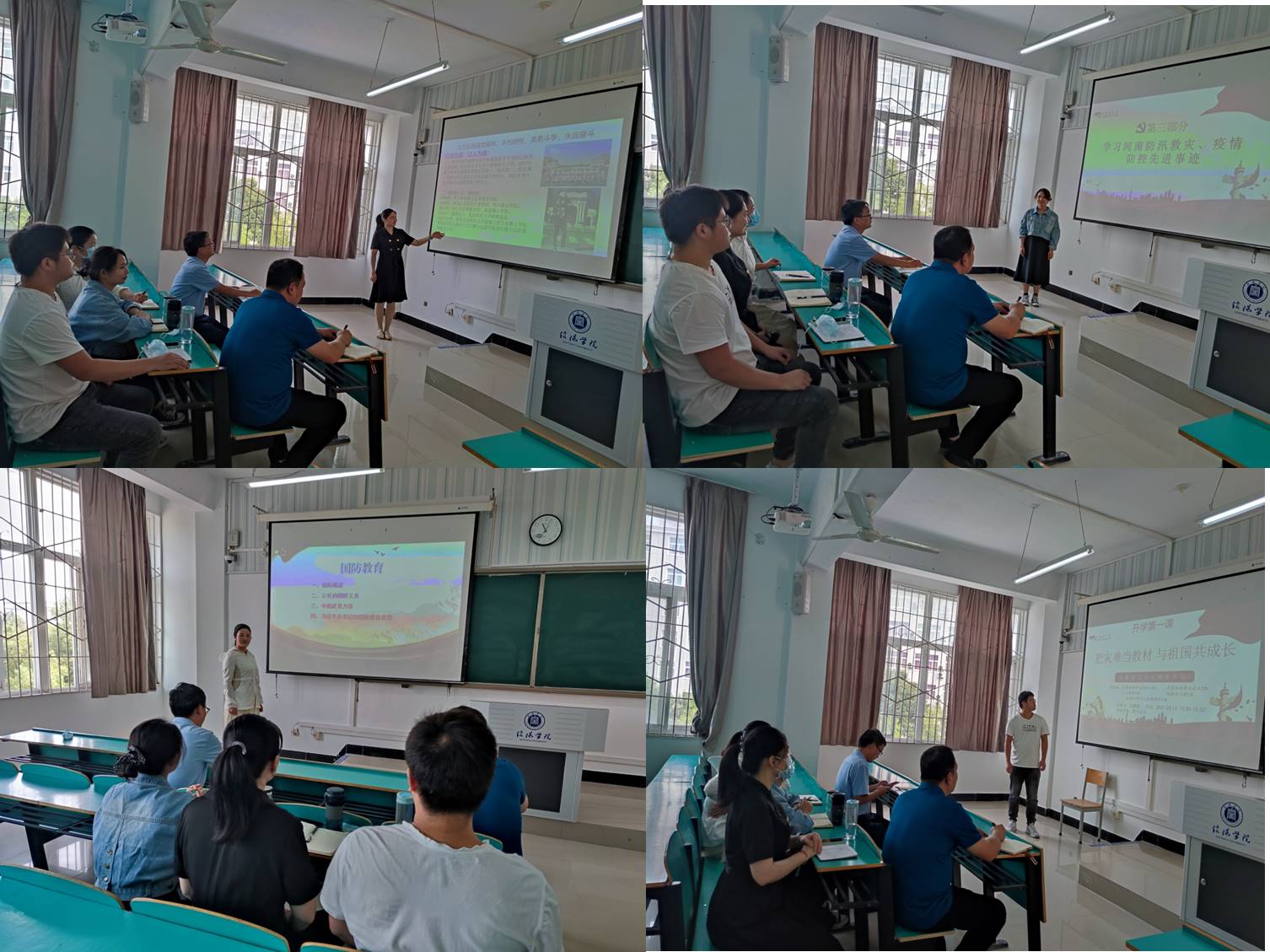 根据学校提供的开学第一课材料,辅导员李书林、代亚南、王淼、沈鹏超四位老师对内容进行了深入学习,从“把灾难当教材,与祖国共成长”、“初识信院”、“安全教育”、“国防教育”、“学生管理”和“评优评先及组织发展”等六个方面确定了新生入学教育主题,四位辅导员依次登台说课,说课结束后大家对照自己的班会课件及班会重点内容进行了交流研讨。