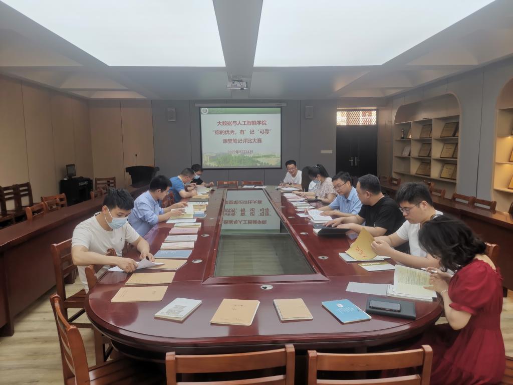 为进一步加强我院学风建设,提高学生课堂听课效率和学习质量,营造良好的学习氛围,5月23日上午,大数据与人工智能学院在数计楼407会议室举行了“你的优秀,有‘记’可寻”学习笔记评比活动。活动邀请了学院党总支副书记毛凤翔、专任教师陈致超、李进、金广坤、朱范炳和全体辅导员担任评委。