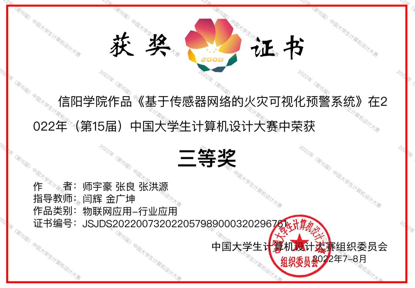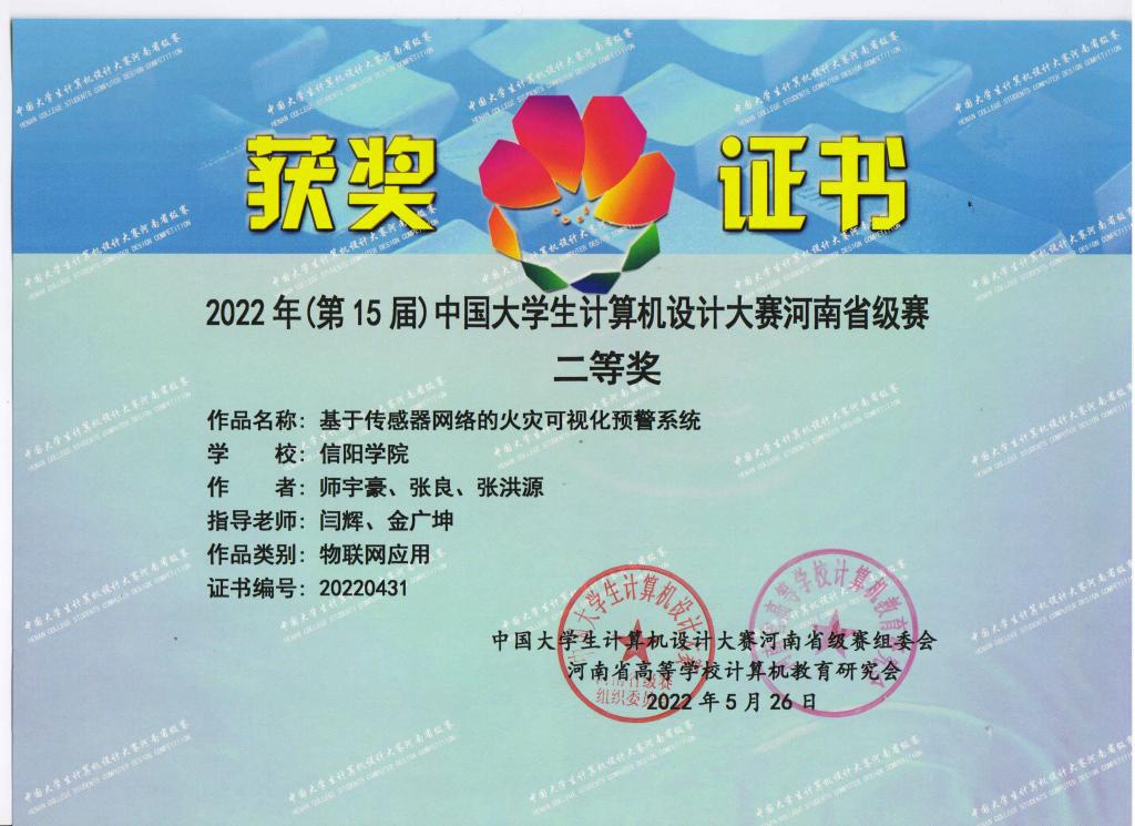 其中,物联网工程本科班师宇豪、张良、张洪源团队获物联网应用类省级二等奖和全国决赛三等奖,指导教师为闫辉、金广坤;计算机科学与技术本科1班高照、侯猛、徐乐宜团队获数媒动画与短片类省级三等奖,指导教师为樊然然。