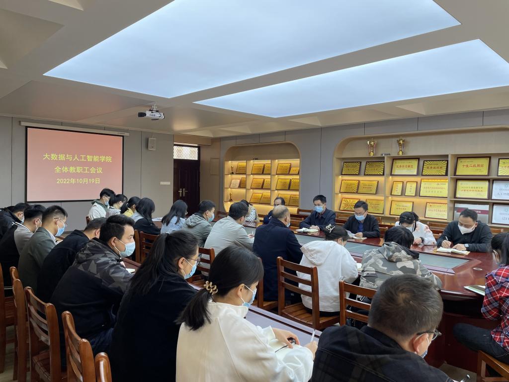 为落实信阳学院疫情防控专题会议精神,10月19日上午,大数据与人工智能学院召开全体教师会议,会议由党总支副书记毛凤翔主持,全体在校教师参加。