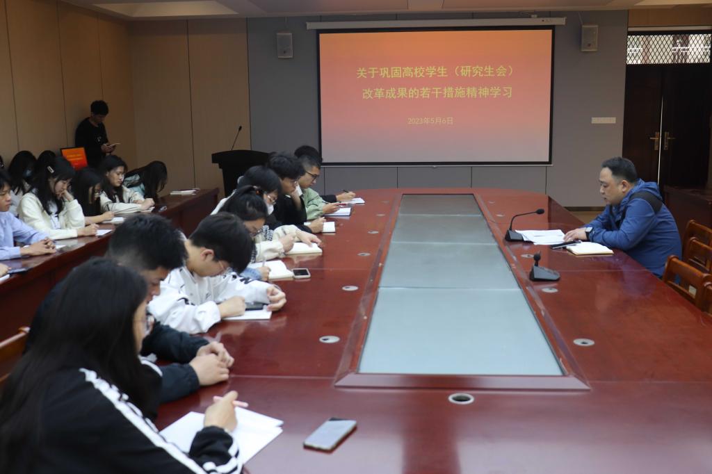 鄢杰首先带领大家学习了共青团中央、教育部、全国学联制定的《关于巩固高校学生会(研究生会)改革成果的若干措施》文件精神,要求全体学生干部深入学习贯彻党的二十大精神,深入贯彻落实习近平总书记关于青年工作的重要思想,进一步深化新时代高校学生会改革和建设,不断提升同学满意度、大局贡献度和社会认可度。