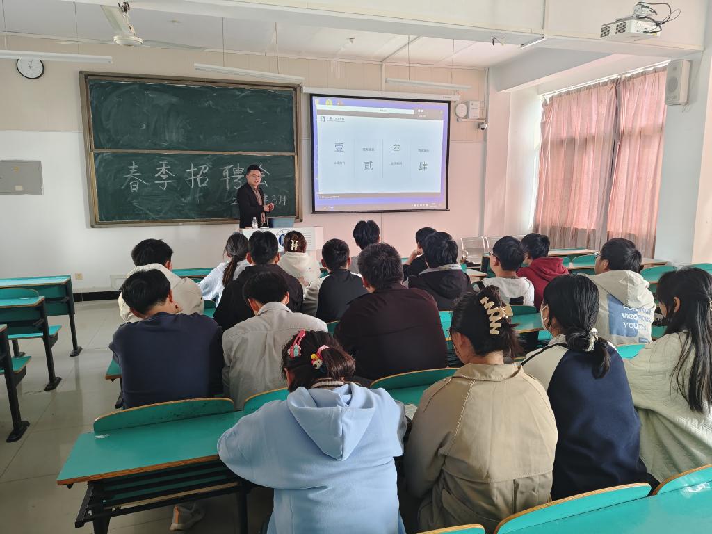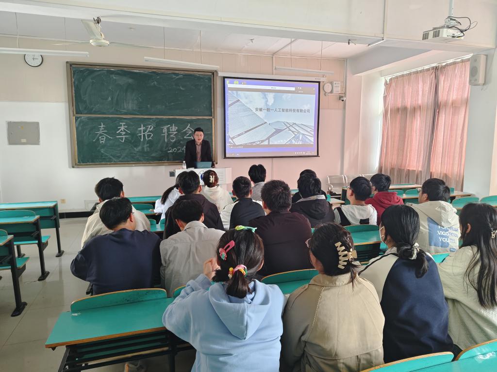 为提高2024届毕业生的就业质量,促进毕业生积极就业,3月21日下午,安徽一数一人工智能科技有限公司在数计楼409举办了2024届毕业生专场招聘会,安徽一数一总经理吴鹏、人事经理吴长青、项目经理尹国焕,大数据与人工智能学院学工干事鄢杰,毕业班辅导员李书林、马国旺,以及2024届在校毕业生参加了本次招聘会。