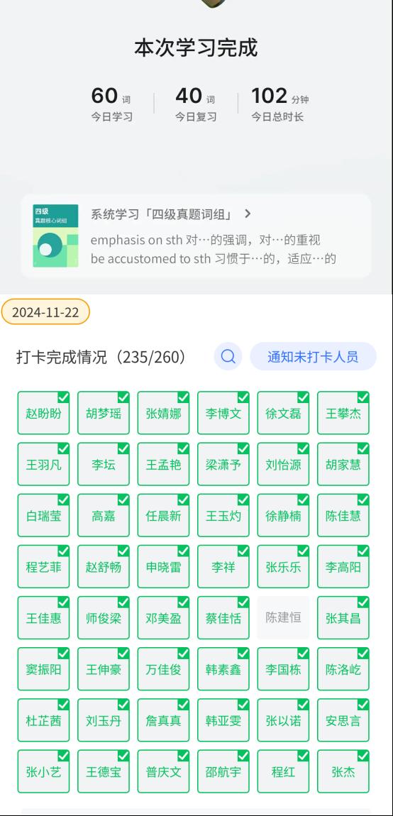 活动期间,全院各年级、各专业的学生积极响应,踊跃报名,参与人数高达200余人,累计打卡次数更是远超1000人次,充分展现了学生们对学习的热情与投入。此次打卡活动形式多样,内容丰富,涵盖了课后笔记分享、四六级英语强化训练、考研知识巩固等多个方面,旨在通过多元化的学习方式,增强学生的学习动力,培养他们的自主学习能力,并提升学生的自律意识。