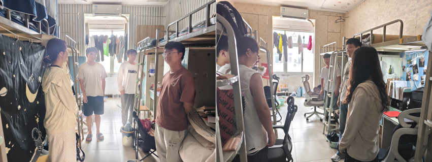 走访过程中,老师们逐间走进宿舍,细致打量搬迁后的居住环境,仔细检查每一处角落,反复询问水电使用是否正常?寝室设施是否存在损坏?党总支书记郭二军关切询问道:“刚搬完宿舍累不累?东西都安置好了吗?要是有什么不方便的地方,一定要和辅导员老师说。” 对于同学们提出的宿舍楼公共卫生间的问题,学工干事表示会积极联络相关部门,帮助同学们解决实际困难,进一步优化宿舍生活环境。