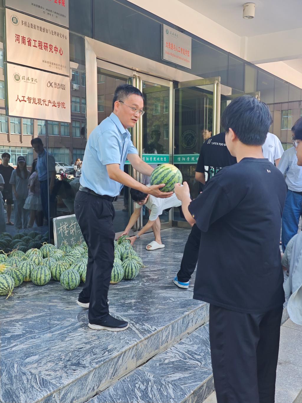 活动的最后环节充满了温馨与清凉。学院领导与老师们亲手将精心准备的慰问品——清甜解暑的西瓜,逐一送到每一位考研学子手中。捧着沉甸甸的西瓜,感受着来自学院的贴心关怀,同学们脸上洋溢着感动与喜悦的笑容。这份特殊的“清凉”不仅驱散了夏日的炎热,更深深温暖了每一位学子的心田。
