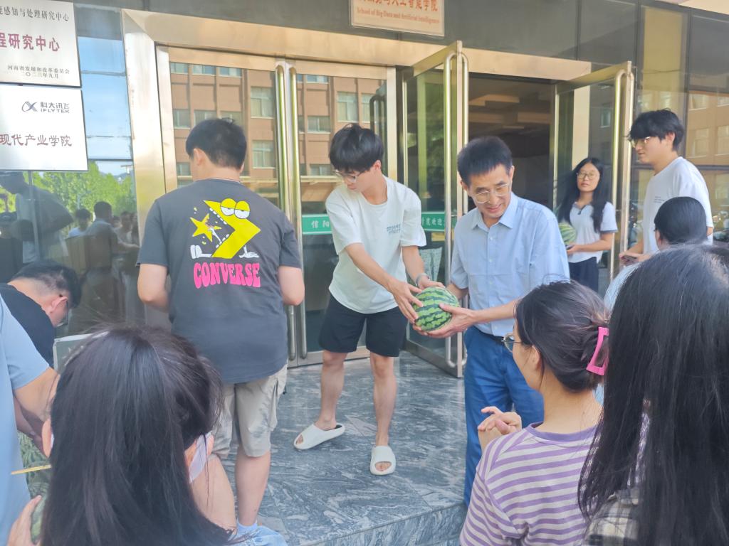 为切实关怀暑期留校备战考研的学子,鼓舞备考士气,营造安心、清凉的学习环境,7月2日上午,大数据与人工智能学院院长邬长安和学院党总支书记郭二军带领学院班子成员和相关辅导员老师前往考研自习室,为全体留校考研学生送上清甜解暑的西瓜以及真挚的关怀与暖心的支持。