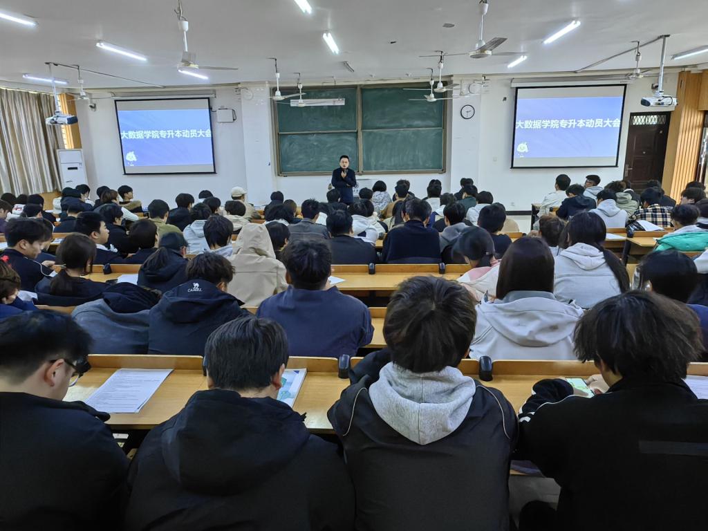 为帮助我院专科一年级学生明晰未来发展路径,科学规划大学生涯,激发升学深造热情,大数据与人工智能学院于11月11日下午在人文楼106教室举办2025年专科生专升本动员大会。学院教学副院长毛凤翔、学工干事鄢杰、中芽专升本教学部总监李博轩老师、专科班辅导员和全体专科学生参加了此次动员会。