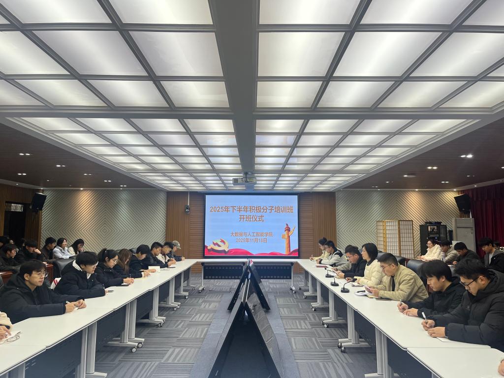 为深入学习贯彻习近平新时代中国特色社会主义思想、党的二十大和二十届二中、三中、四中全会精神,贯彻落实《中国共产党章程》《中国共产党发展党员工作细则》《全国党员教育培训工作规划(2024—2028年)》等相关规定,进一步提高发展党员工作质量。11月18日下午,大数据与人工智能学院在人文楼208会议室举行2025年秋季入党积极分子培训班开班仪式,学院党总支书记高昌慧,组织委员刘明珠,学生党支部书记杨韫幔、周川川,组织员姬莉以及全体入党积极分子参加了开班仪式。会议由刘明珠主持。