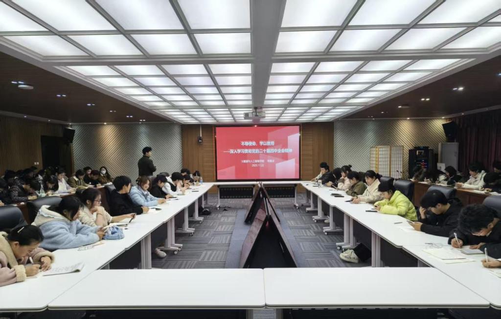 2025年11月22日晚,大数据与人工智能学院党总支部于人文楼208会议室举办以“不辱使命,学以致用——深入学习贯彻党的二十届四中全会精神”为主题的第五次专题党课,本次党课由师春灵老师主讲,学院2025年下半年入党积极分子参与学习。