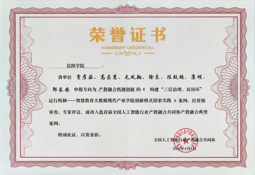 信阳学院智慧教育大数据现代产业学院为破解产教融合中存在的治理缺失、资源引入不足、协同机制不健全等问题,创新构建了“三层治理、双闭环运行”机制。该机制通过“理事会—院长负责制—专业/专项工作委员会”三层治理体系实现权责利一体化配置,并以“资源投入—绩效考核—正向驱动”和“项目—成果—教学反哺”双闭环保障运行持续性与实效性。实施以来,学院在人才培养质量、产业服务能力、社会示范效应等方面取得显著成效,形成了可复制、可推广的制度化协同育人范式,为区域产业升级与教育数字化转型提供了有力支撑。