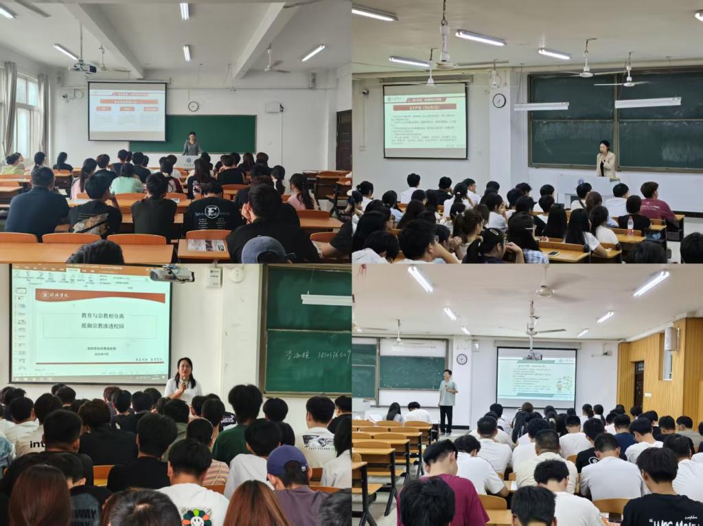 其次,各位辅导员老师向2025级新生介绍党的宗教政策,讲述党的宗教工作基本方针,重点强调“任何组织和个人不得利用宗教进行妨碍国家教育制度的活动”“任何组织和个人不得在学校进行宗教活动”等相关内容。最后,提醒各位同学要提高政治鉴别力,自觉抵制宗教渗透和校园传教等。