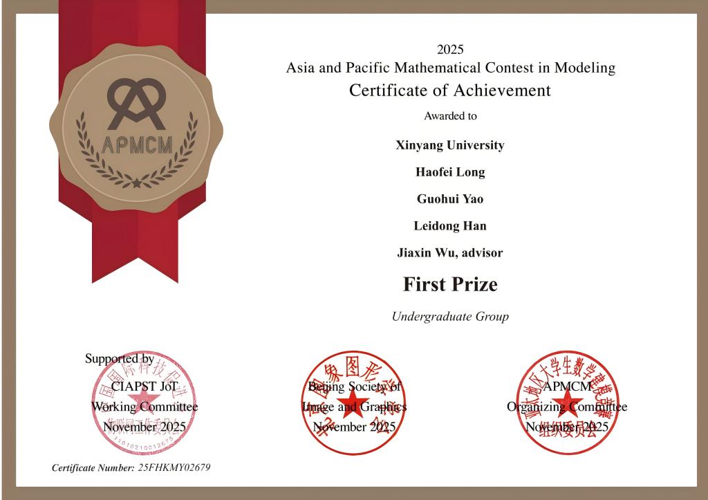 近日,由中国国际科技促进会物联网工作委员会和北京图象图形学学会联合主办、亚太地区大学生数学建模竞赛组委会组织的第十五届亚太地区大学生数学建模竞赛正式公布获奖名单。本次竞赛吸引980所高校、2万7千多名学生参赛,覆盖全部39所985高校、114所211高校,以及美国加州大学伯克利分校、英国牛津大学、香港中文大学等国内外知名院校,我院学子凭借扎实的专业功底与突出的创新能力,成功斩获国家级一等奖1项。