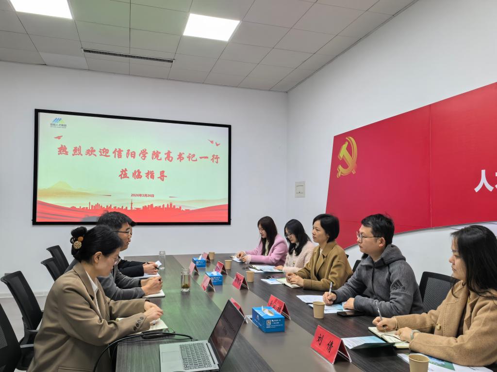 为深入落实学校2026年招生就业工作部署,精准对接地方人才服务资源,拓宽2026届毕业生就业渠道,3月26日上午,计算机与人工智能学院党总支书记高昌慧带领辅导员黄礼祥、杨韫幔、刘倩、徐瑞爽一行,前往信阳市人才集团有限公司开展访企拓岗促就业专项活动。信阳市人才集团有限公司副总经理李先东、副总经理刘宁,人才招引事业部部长常莹莹热情接待了学院一行。