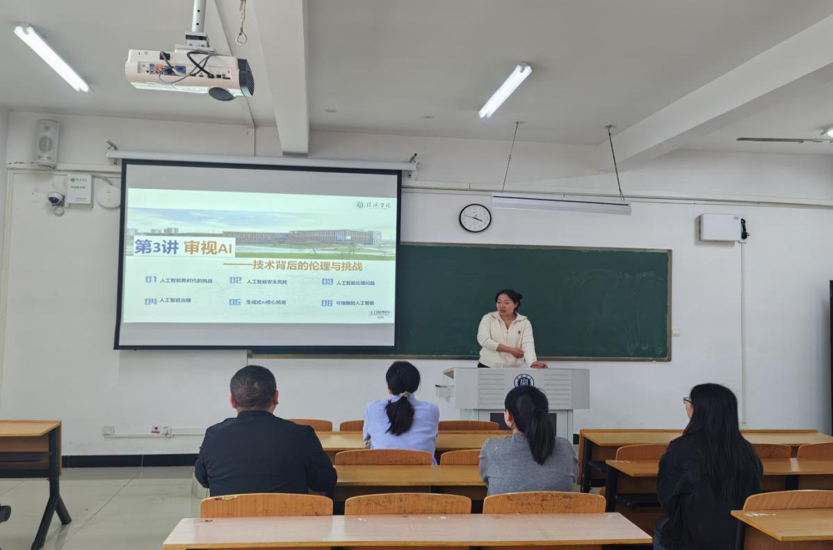 随后,吴媛媛教师主讲《人工智能通识基础》课程,教学内容为审视AI—技术背后的伦理与挑战,围绕人工智能新时代的挑战、人工智能安全风险、人工智能伦理问题、人工智能治理等六个方面阐述人工智能技术应用中的道德风险与社会问题。在评课的过程中,老师们从教学思路的清晰度、教学重难点的把握程度、教学风格、课堂气氛、教态和语速,以及板书等多方面进行评价和交流,对教学过程给予充分肯定,并对不足之处提出了更好的改进建议和更高的教学要求。