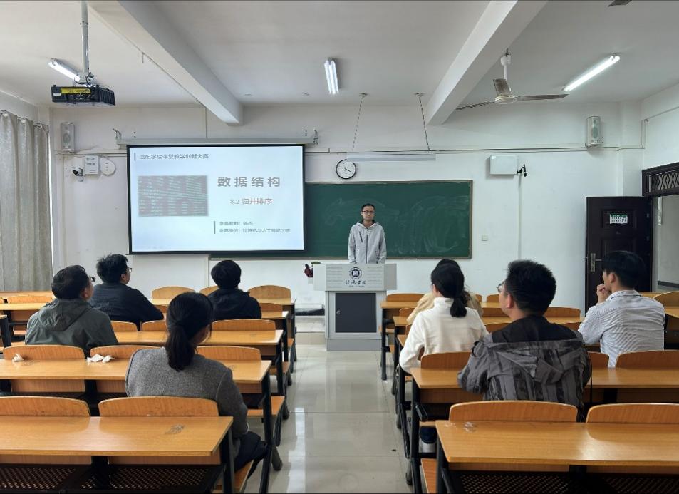 比赛严格参照大赛流程,设置了三分钟说课、十分钟模拟授课及两分钟专家提问三个环节。所有参赛教师精心准备,深入打磨教学内容,巧妙设计教学方案。杨杰老师以《数据结构》中的“归并排序”为授课内容,逻辑清晰、层层递进,展示了经典算法的高效实现思路;王勇老师围绕《Java程序设计》展开教学,案例生动、讲解透彻,体现了编程语言的实用性与灵活性;李金鹏老师则聚焦《离散数学》,以严谨的推理和巧妙的示例,呈现了数学基础在计算机科学中的重要应用。三位教师在模拟授课中各展所长,呈现了精彩纷呈的课堂实况。