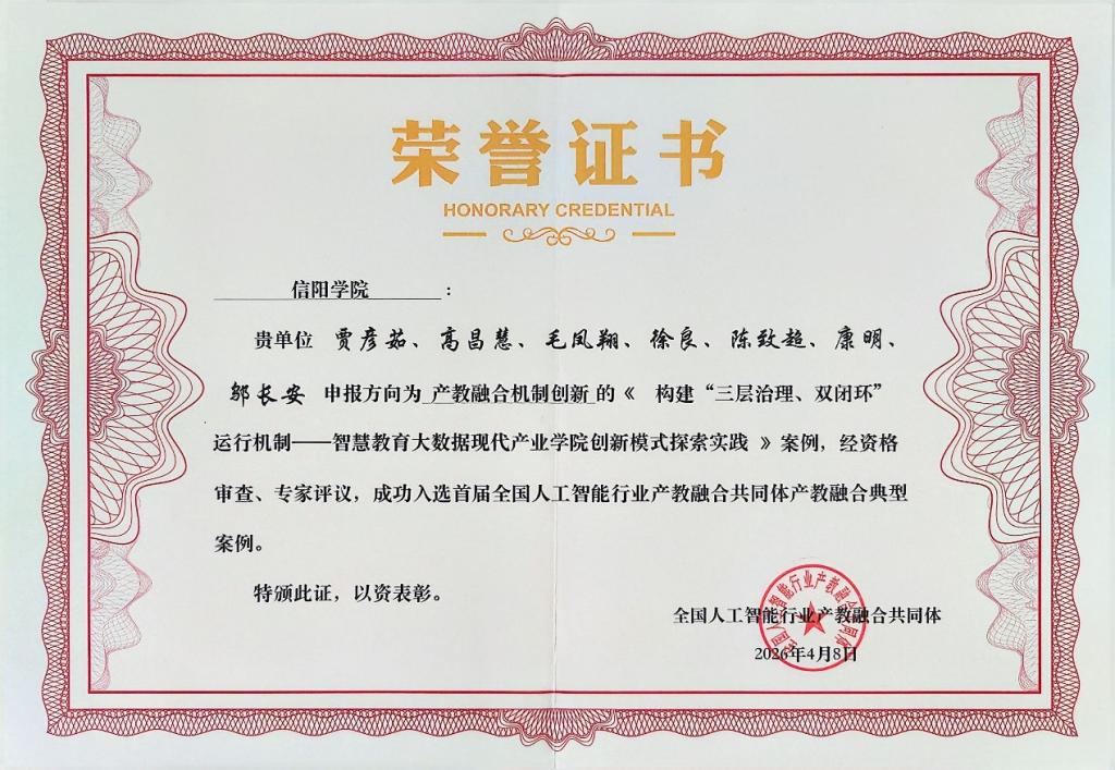 本次年会正式发布了全国人工智能行业产教融合共同体2026年度建设任务,杨康总经理宣布了30家新增成员单位名单,路林吉教授公布了2025年产教融合典型案例获奖名单。我院教师团队申报的案例从全国126项申报案例中脱颖而出,成功入选24项年度产教融合典型案例,学院教师代表作为获奖单位代表上台领奖。这一荣誉充分彰显了信阳学院及计算机与人工智能学院在产教融合、校企合作领域的扎实实践与突出成效,体现了全国人工智能行业产教融合共同体对我院深化产教融合工作的高度认可。学院将以此次获奖为契机,充分发挥典型示范引领作用,持续深化产教融合改革,不断优化人才培养方案,为区域数字经济和人工智能产业发展培养更多高素质应用型人才。