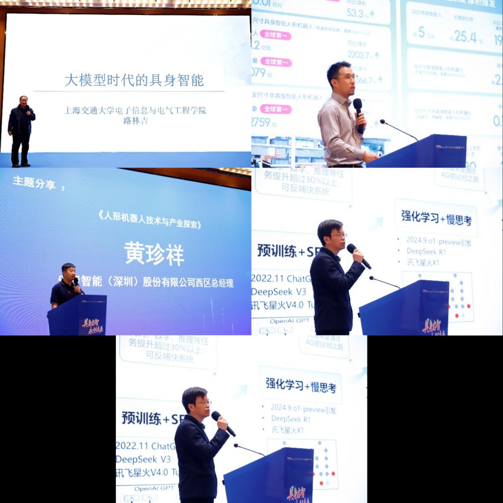 上午的开幕式暨研讨会主题分享环节在永川福朋喜来登酒店三楼宴会厅举行。来自企业及高校的专家围绕生产过程工业人形数据采集、具身智能技术发展、人形机器人产业探索、产业发展与人才需求趋势等主题作了深度分享。深圳市优必选科技股份有限公司西南大区总监艾珅分享了《生产过程工业人形数据采集中心方案,政策·产业·人才三维协同落地路径》,提出通过校企共建数据采集中心为产业模型训练提供高质量“数据燃料”,进而抢占人形机器人职业教育新高地、共育未来产业紧缺人才。上海交通大学电子信息与电气工程学院教授路林吉以《大模型时代的具身智能》为题,从多模态感知到实时决策的系统性角度,勾勒出具身智能这场“智能革命”的技术图谱与产业远景。乐聚智能(深圳)股份有限公司西区总经理黄珍祥分享了人形机器人从“能动”到“能用”的产业探索之路,指出数据是驱动人形机器人全生命周期迭代的核心引擎,“大脑加小脑”的融合突破将是决胜关键。科大讯飞股份有限公司产教融合业务西南区总经理田荣阳围绕《具身智能产业发展与人才需求趋势》作了精彩分享,强调具身智能的竞争归根结底是人才生态的竞争,产教融合、校企共育是破解这一命题的关键路径。