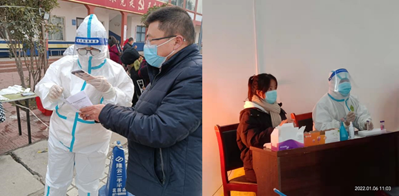 河南省新密市新华路五里店村委会,19级数据1班郭萌煜在检查返乡村民的核酸检测证明;20级计科1班张娅雯在河南禹州市谭陈村协助医疗人员为居民进行核酸检测。