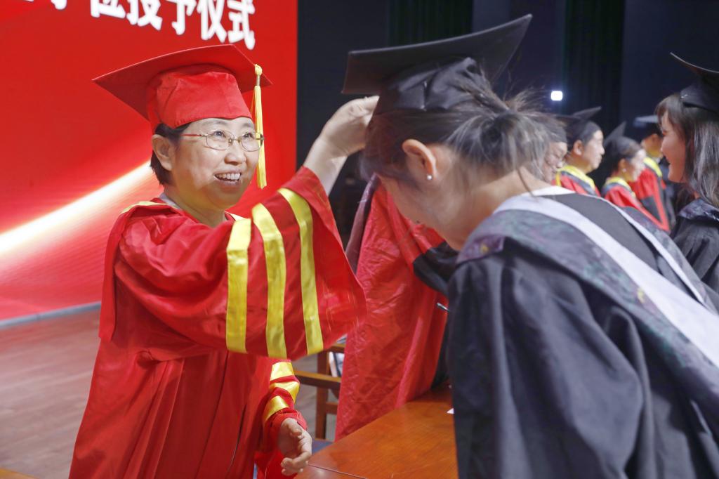 副院长毛凤翔宣读《信阳学院关于授予2024届本科毕业生学士学位的决定》,校领导、专家教授们为毕业生代表正冠拨苏,授予学士学位。