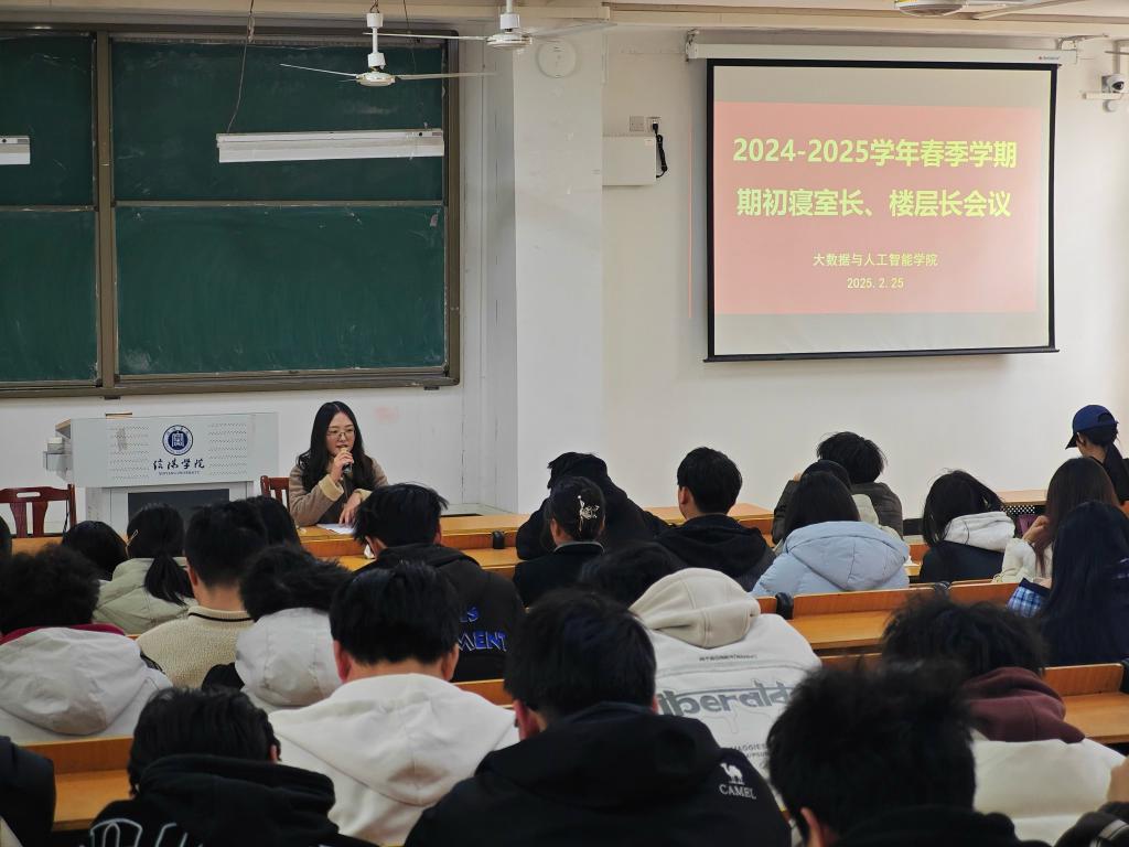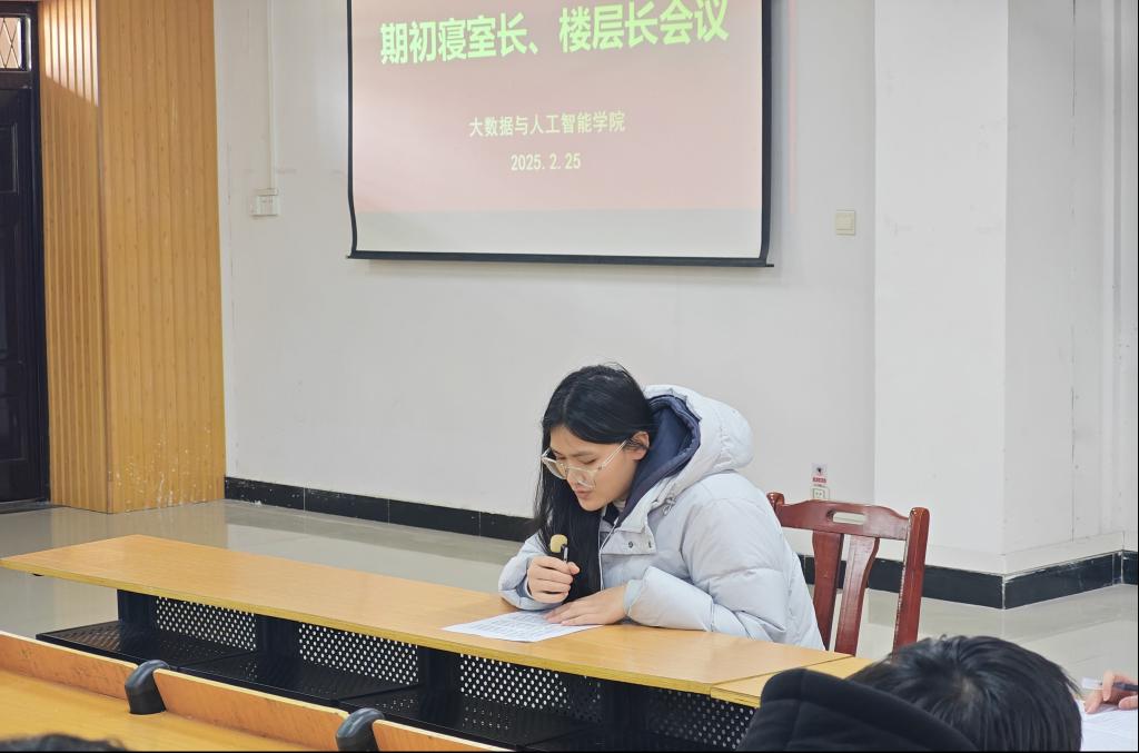 为强化新学期学生宿舍安全管理,提升寝室长、楼层长队伍的责任意识与服务能力,2月25日中午,大数据与人工智能学院在人文楼108教室召开新学期寝室长、楼层长大会。公寓管理负责老师杨韫幔、学生干部和全体寝室长、楼层长参加会议。