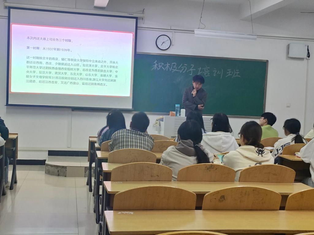 2024年11月1日夜晚,在人文楼415教室举行了以《战争击不垮的大学:中国高校迁徙的集体记忆》为主题的党课,本次培训由科大讯飞驻校工程师陈远航主讲。陈远航老师表示在抗日战争的烽火岁月中,中国高校展现了不屈不挠的精神,这种不屈不挠的精神,正是我们今天应该学习和传承的。面对战火的威胁,全国70多所高校被迫迁址,踏上了艰难困苦的内迁流亡之路,这场史无前例的大迁徙,不仅保存了中国高等教育的火种,更是民族精神与家国情怀的强烈释放。他们联合办校,积极投入抗战,增设国防教育课程,进行战时科研和战时生产,有效地支持了抗日战争。中国高校的迁徙历史,是一段充满挑战与牺牲的历程,也是一段展现中国人民智慧与勇气的史诗。它不仅是教育史上的一段佳话,更是中华民族精神的宝贵财富,值得我们永远铭记和传承。