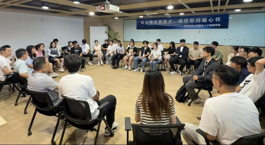 7月1日,信阳学院大数据与人工智能学院教学副院长毛凤翔带领学院学工负责人鄢杰赴合肥科大讯飞总部,专程看望正在科大讯飞总部实习的56名学生,实地调研学生实习进展,传递学院关怀,深化校企协同育人实效。科大讯飞实验室产品部总监李奎、组织与人才发展师桂安琪、软件开发工程师张彧林、院校运营经理詹丽君等共同参与活动。